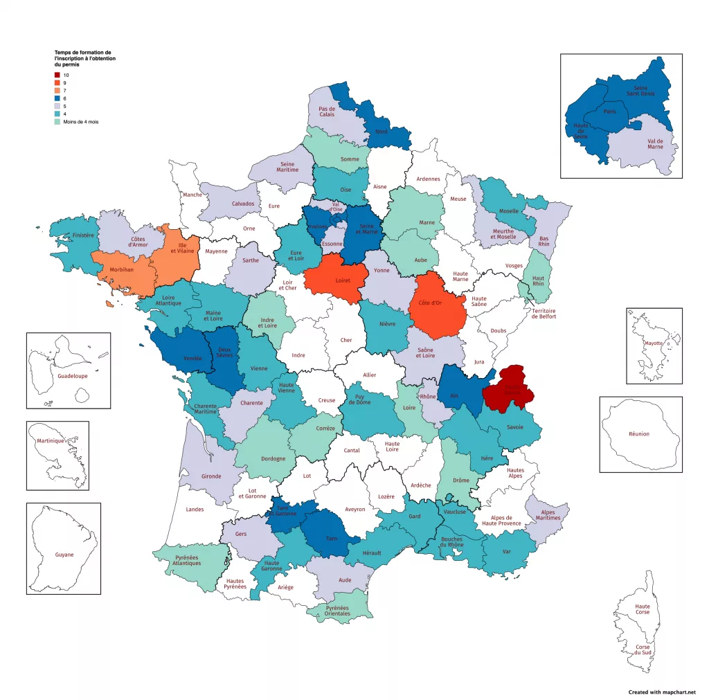 Alors que le temps de formation sur l’ensemble du territoire est de 5 mois, certains départements connaissent des délais bien plus longs. C’est le cas notamment de la Haute-Savoie où les élèves attendent en moyenne 10 mois avant d’obtenir l’examen. Même punition ou presque en Côte-d’Or et dans le Loiret avec 9 mois d’attente. Suivent, enfin, l’Ille-et-Vilaine et le Morbihan avec 7 mois.