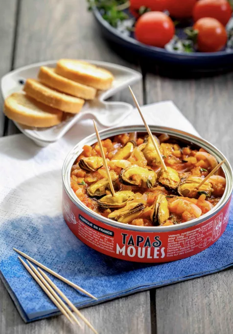 Une recette de caractère avec 55 % de moules à l’escabèche subtilement agrémentées de paprika fumé.